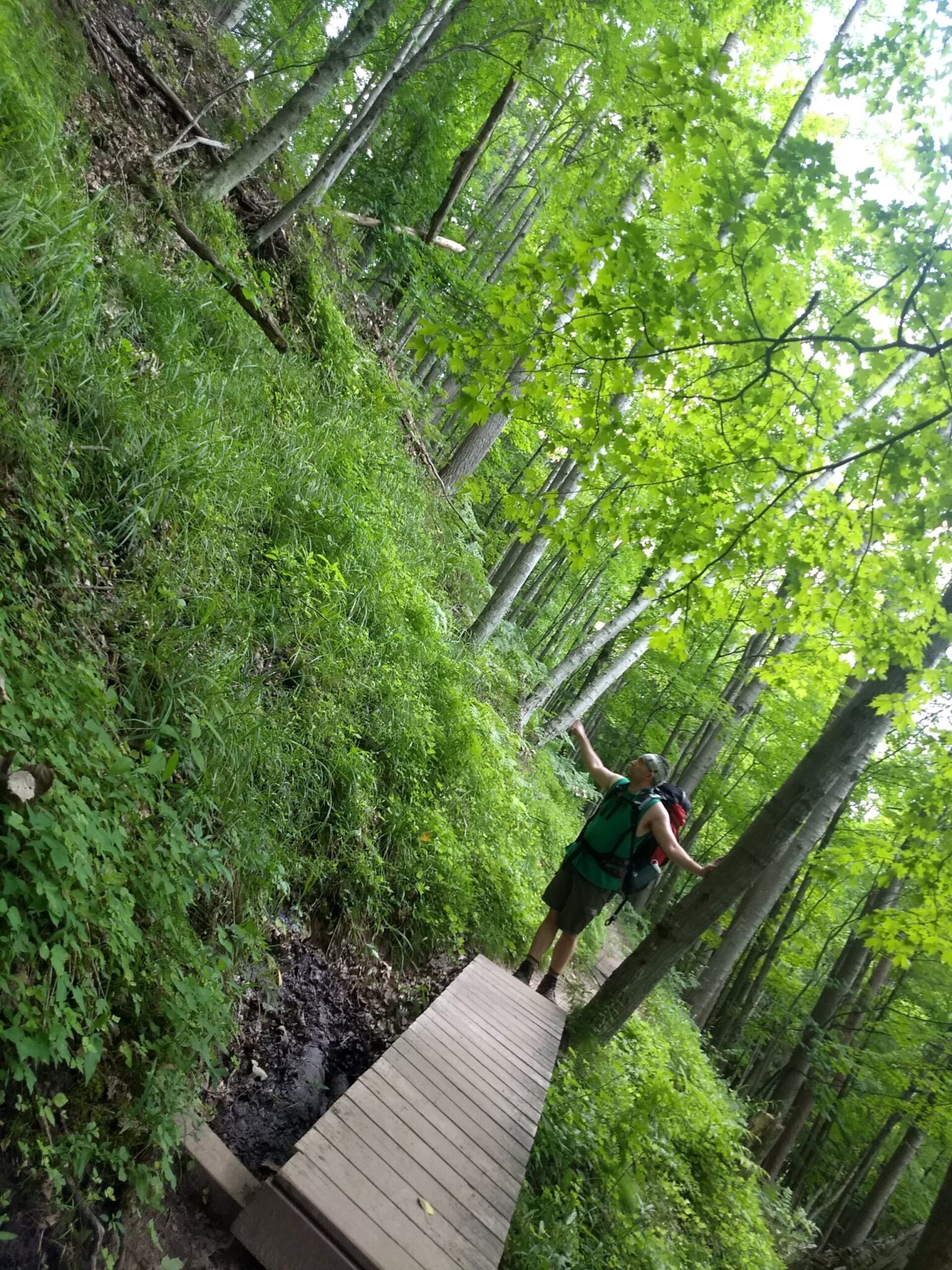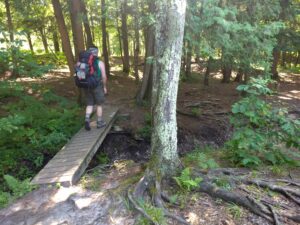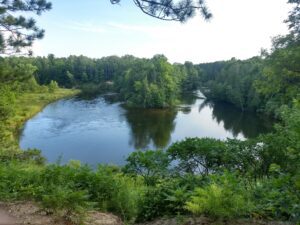 There are a couple good camping spots on the NCT side just before the suspension bridge and in retrospect we should have stopped there for our first night. Again, our plan was to do it in three days, so ~9 miles a day out of the ~27 total that make up the loop. The Manistee side was so full we ended up hiking 13 or 14 miles on day 1 before we found a spot to camp, fully half the trail. Made day 3 underwhelming, but felt awful because we were low on bug spray and the mosquitoes are quite bad between Red Bridge and the Upper River Road trailhead parking lot (which is where we started). That’ll be the start for you, the trail in that section goes through what is essentially a bog before the climb up I mentioned.