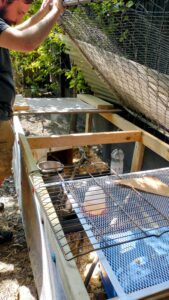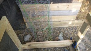 - Hardware (I bought hinges and was planning to make a nice lid for this, but ran out of time, using an old section of chain link gate instead, attached to the iron fence behind with zip ties and weighted down with logs and bricks. Get ‘er done, it works. You’ll also want some assorted hooks to hang your feeder and waterers from, and a secure latch if you’ll be putting this somewhere that it needs to be predator-proofed.