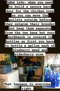 - Hardware (I bought hinges and was planning to make a nice lid for this, but ran out of time, using an old section of chain link gate instead, attached to the iron fence behind with zip ties and weighted down with logs and bricks. Get ‘er done, it works. You’ll also want some assorted hooks to hang your feeder and waterers from, and a secure latch if you’ll be putting this somewhere that it needs to be predator-proofed.
