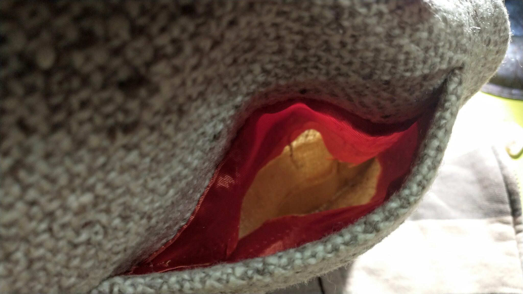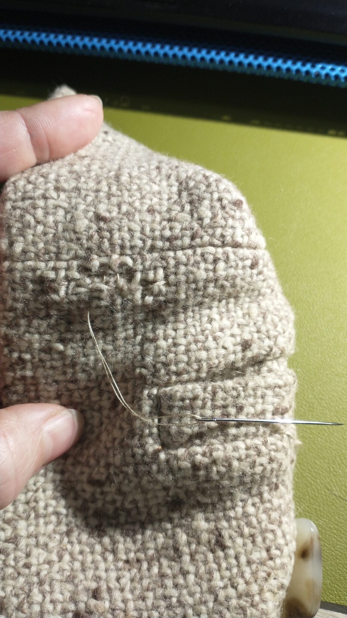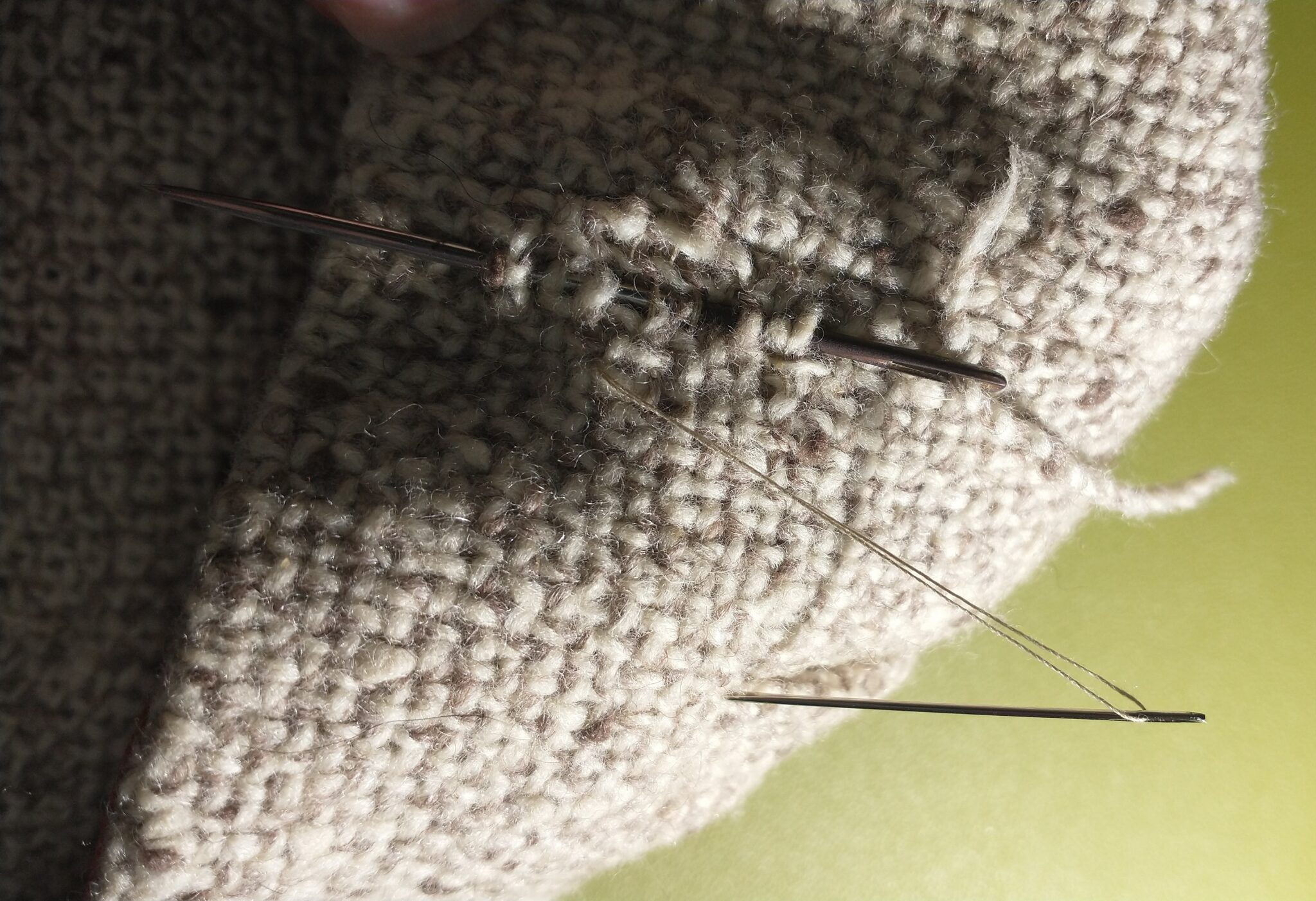 You’ll need matching thread or darning yarn of a similar color and weight if you want to do an invisible repair. I was able to pick out enough thread from the seams working from gap made from a tear in the lining stitching. I guess that loose lining is another thing that I need to fix, but it is convenient at the moment to have easy access to the guts of the garment. You can open up a seam if you need to, preferable one that’s not too noticeable. Use a seam ripper to carefully unpick enough stitches to harvest some threads from the hem or another wide seam. Restitch it when you’re done.