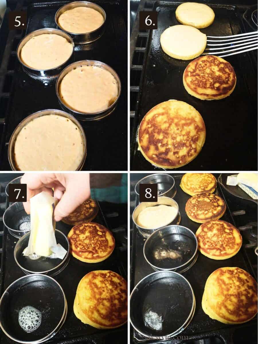 - Place the crumpet rings or metal cookie cutters on the griddle, butter the griddle (I use a stick of butter and lightly touch it to the surface inside each ring.