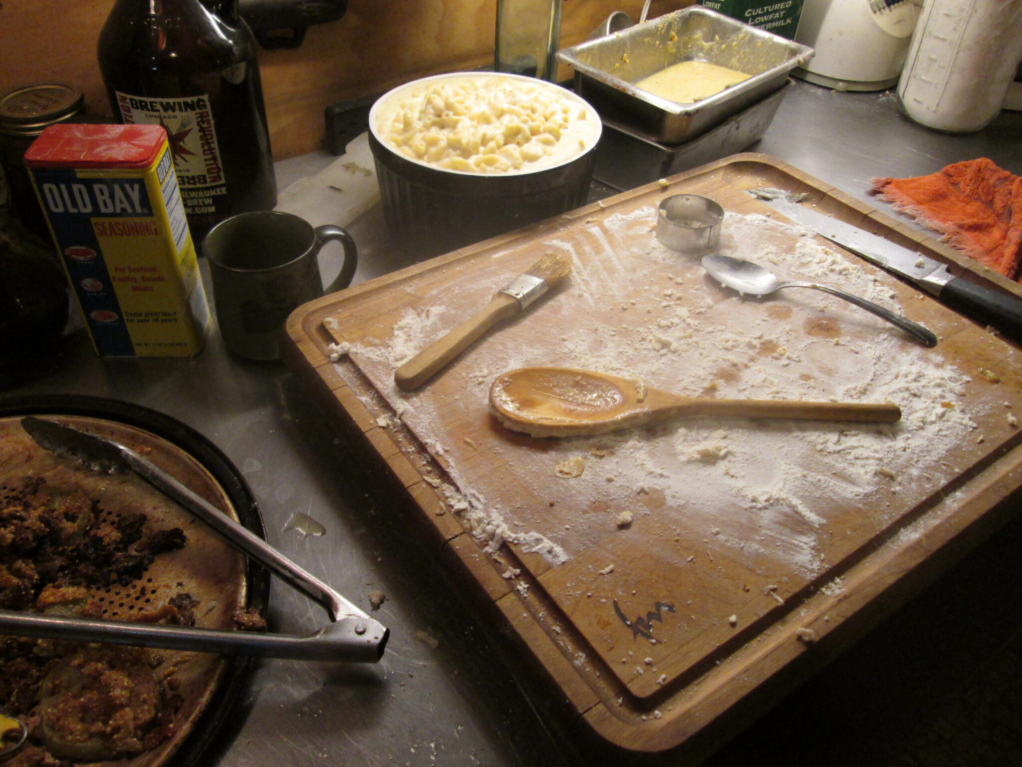 Revolution beer, Old Bay, mac n cheese, some fried things, and a well-flowered cutting board. Recipe for a delicious beginning to a delicious evening!