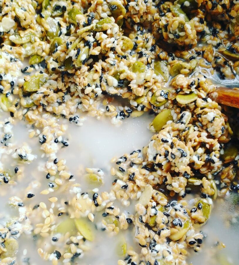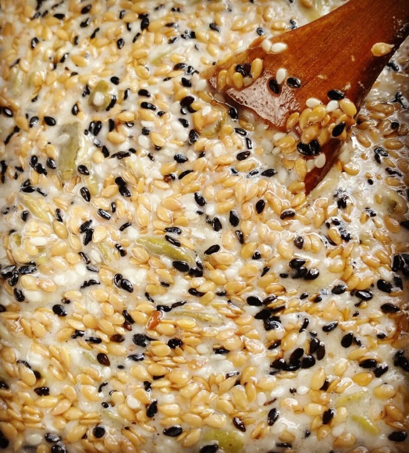 I’ll share my variation of these seed crackers below, although this is a pretty adaptable method. You can adjust the seeds and flavorings to your preference, or what you have in your pantry. I added some ground dried lambsquarters (seeds with some leaves) and black sesame seeds.
