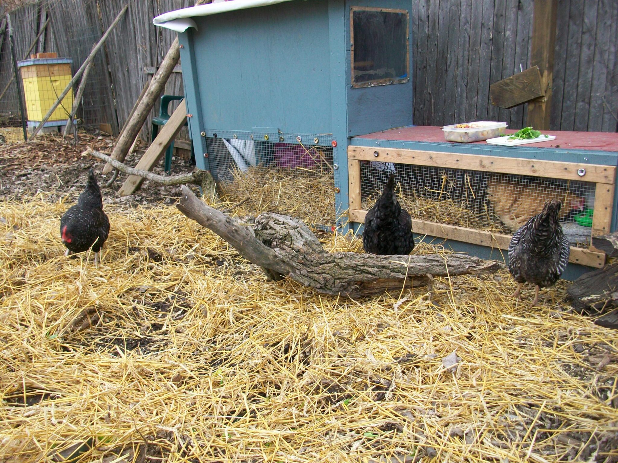 The hens were thrilled to get some fresh wheat straw to scratch around in (lots of wheat left in those hulls!) and the bees were taking advantage of the unseasonably warm weather to clear dead bees from the hive entrance (I try to help them with this bit of housecleaning) and go out for their “cleansing flights” (bees, unless they are really sick, will not soil their hive, but rather wait for warmer or clear days in the winter to fly out for short trips). I am a little bit worried about our hive- they’re our first bees, and while we got a healthy nuc (a mini-colony with several established frames with honey, brood, worker bees, and of course a queen) of locally raised bees from one of the IL bee inspectors, they got a late start and don’t seem to be a terribly strong colony. I suspect that some may have swarmed during a stretch of really hot weather this summer but I’m not sure… we tried feeding them to build up their numbers and help them draw out comb, but they didn’t seem that interested in the sugar syrup, even when I made it with chamomile tea as an older Eastern European beekeeper suggested to me)- I only ever saw wasps and ants at the feeder so stopped filling it… or in the bee patties (Bee-Pro and sugar syrup) we put in their hive a couple times towards the end of the season. I’m not impressed with the Bee-Pro, as our bees seemed to ignore it altogether… though maybe they only snacked while we weren’t looking.