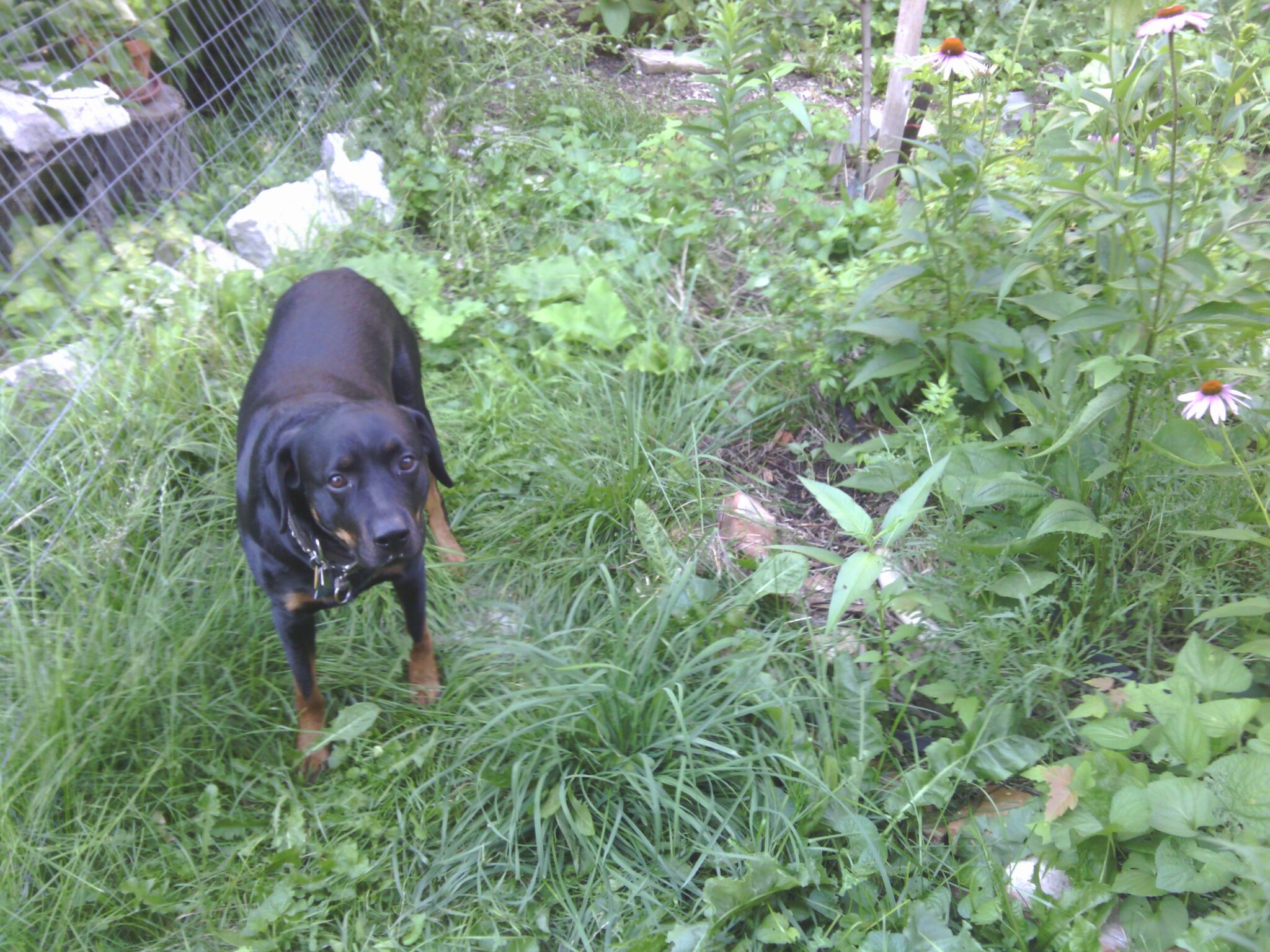 Welcome to the jungle, it gets worse here every day… well, it will if I don’t hack down this burdock before those seedheads harden… but it’s pretty in bloom, if thorny. But so are roses. The bees need them both.